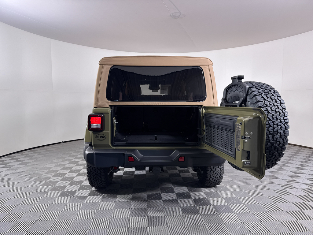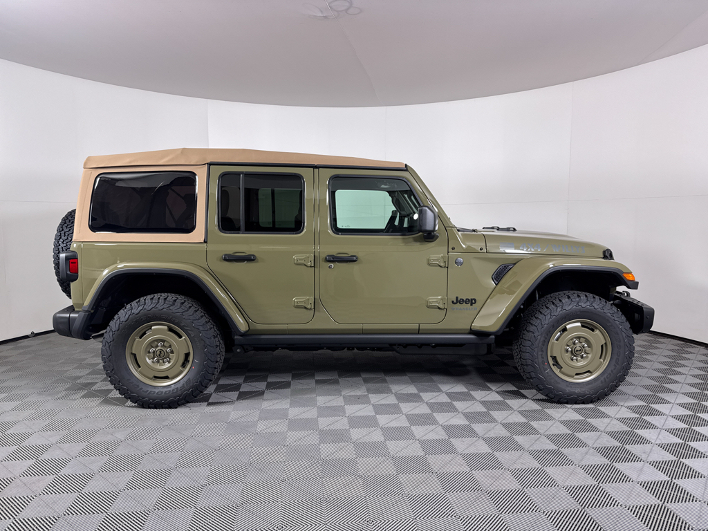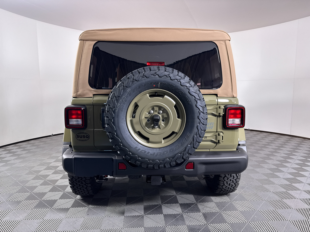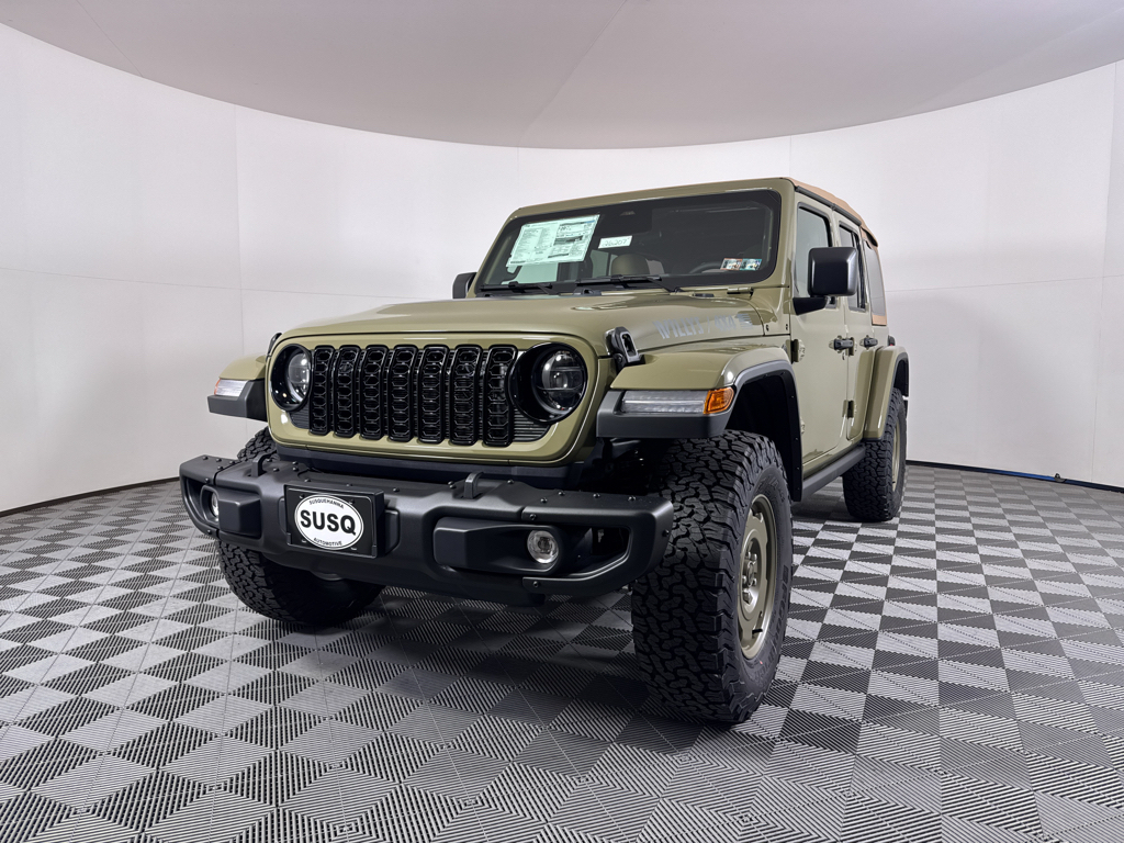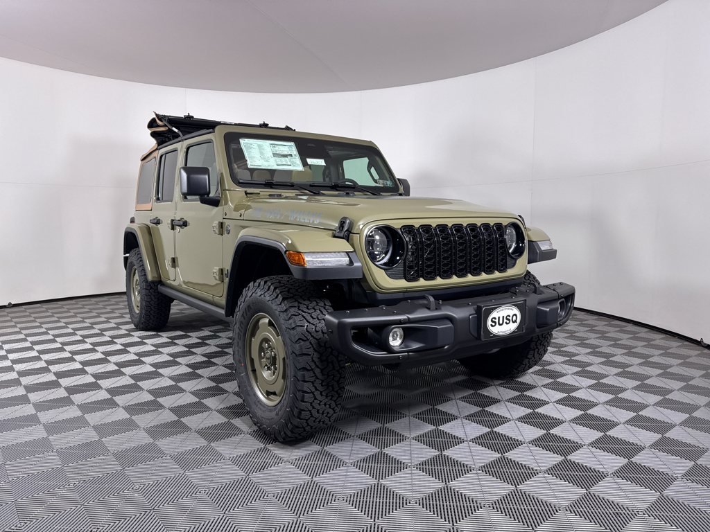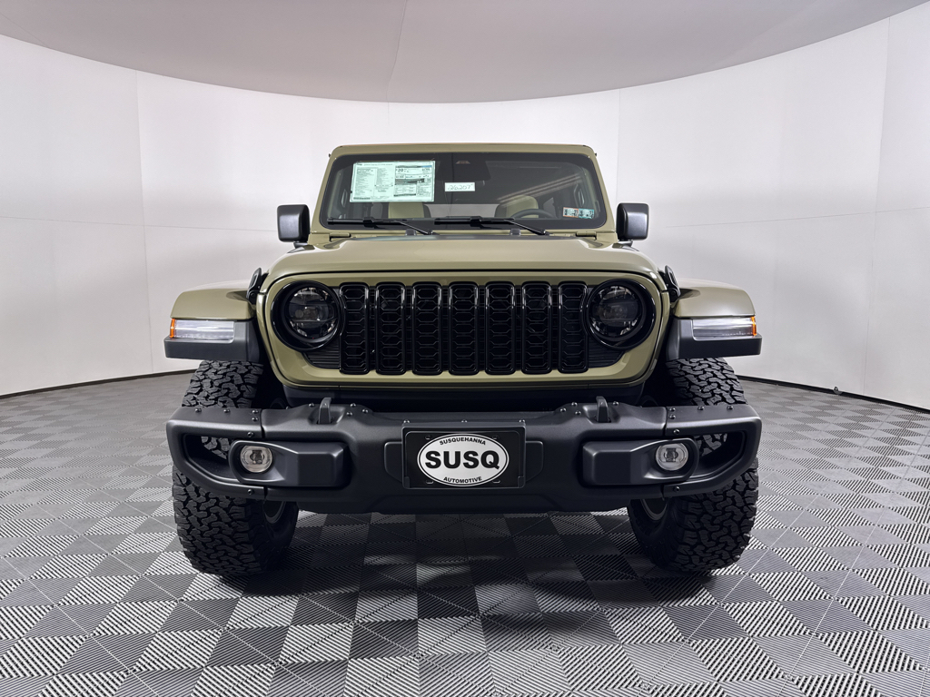 Convenience Group: Emergency/Assistance Call; 2-Door Passive Entry. Front Door Locks; Remote Start System; Cluster 7.0" TFT Color Display; Universal Garage Door Opener; Heated Front Seats; Air Conditioning W/Auto Temp Control; Heated Steering Wheel; Air Filtering. Quick Order Package 22H Willys 41: Premium Tan Sunrider Soft Top; 7 & 4 Pin Wiring Harness; Willys '41 Retro Edition Wrangler Decal; Conventional Differential Front Axle; 4WD Willys '41 Swing Gate Decal; MOPAR All-Weather Floor Mats; Dana M210 Wide HD Tube Front Axle; Body Color Grille W/Gloss Black Rings; Daytime Running Lamps LED Accents; Front LED Fog Lamps; LED Premium Reflector Headlamps; E-Locker Rear Axle; Body Color Rubicon Highline Flare; Corning Gorilla Glass; Security Alarm; 4.10 Rear Axle Ratio; Willys '41 Retro Edition Tailgate Plaque; Willys '41 Retro Shift Bezel Insert; 5. 675 lbs GVWR; Class II Receiver Hitch; Steel Front Bumper; 17" X 7.5" Fully Painted Wheels; Advanced Brake Assist; Willy's Suspension; Automatic Headlamps; Willys '41 Retro Edition Hood Decal; Deep Tint Sunscreen Windows; Off-Road Plus Mode; Willys '41 US Edition U.S. Hood Decal; Full Speed Forward Collision Warning Plus; Rock Protection Sill Rails; Willys '41 Retro Edition Buzz Model; 97 MPH Vehicle Max Speed Calibration; Cloth Low-Back Bucket Seats; Power Heated Mirrors; Auxiliary Switches; Adaptive Cruise Control W/Stop; Dana M220 Wide Rear Axle; Premium Wrapped Steering Wheel; LT285/70R17C BSW Off-Road Tires; Sun Visors W/Illuminated Vanity Mirrors; Steel Rear Bumper. Steel Power Dome Hood Package (DISC): Power Dome Dual Vented Hood. Quick Order Package 24H Willys 41: Premium Tan Sunrider Soft Top; 7 & 4 Pin Wiring Harness; Willys '41 Retro Edition Wrangler Decal; Conventional Differential Front Axle; 4WD Willys '41 Swing Gate Decal; MOPAR All-Weather Floor Mats; Dana M210 Wide HD Tube Front Axle; Body Color Grille W/Gloss Black Rings; Daytime Running Lamps LED Accents; Front LED Fog Lamps; LED Premium Reflector Headlamps; E-Locker Rear Axle; Body Color Rubicon Highline Flare; Corning Gorilla Glass; Security Alarm; 4.10 Rear Axle Ratio; Willys '41 Retro Edition Tailgate Plaque; Willys '41 Retro Shift Bezel Insert; 5. 675 lbs GVWR; Class II Receiver Hitch; Steel Front Bumper; 17" X 7.5" Fully Painted Wheels; Advanced Brake Assist; Willy's Suspension; Automatic Headlamps; Willys '41 Retro Edition Hood Decal; Deep Tint Sunscreen Windows; Off-Road Plus Mode; Willys '41 US Edition U.S. Hood Decal; Full Speed Forward Collision Warning Plus; Rock Protection Sill Rails; Willys '41 Retro Edition Buzz Model; 97 MPH Vehicle Max Speed Calibration; Cloth Low-Back Bucket Seats; Power Heated Mirrors; Auxiliary Switches; Adaptive Cruise Control W/Stop; Dana M220 Wide Rear Axle; Premium Wrapped Steering Wheel; LT285/70R17C BSW Off-Road Tires; Sun Visors W/Illuminated Vanity Mirrors; Steel Rear Bumper. 41. **Equipment listed is based on original vehicle build and subject to change. Please confirm the accuracy of the included equipment by calling the dealer prior to purchase.**